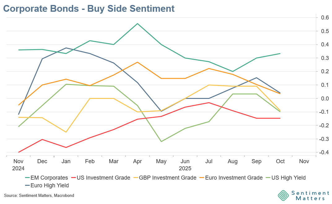 EM Debt: very bullish — both local and hard-currency bonds saw gains. Local bonds are the most popular fixed-income asset, helped by USD bearishness.