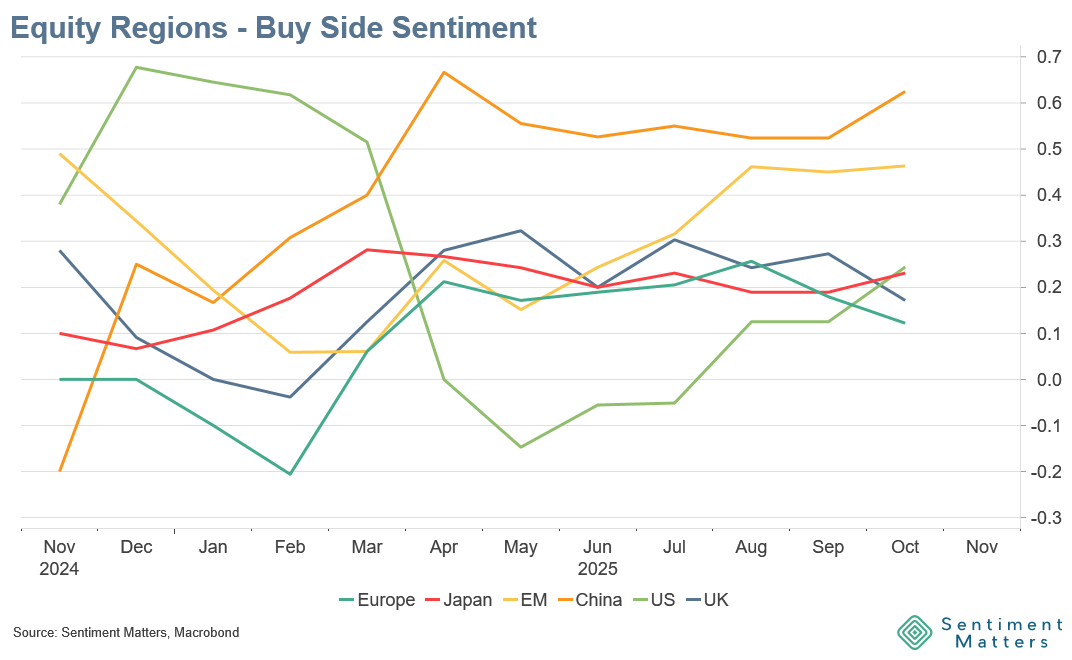 Europe: sentiment fading — now the least popular DM region after downgrades. Spring optimism peaked in August.