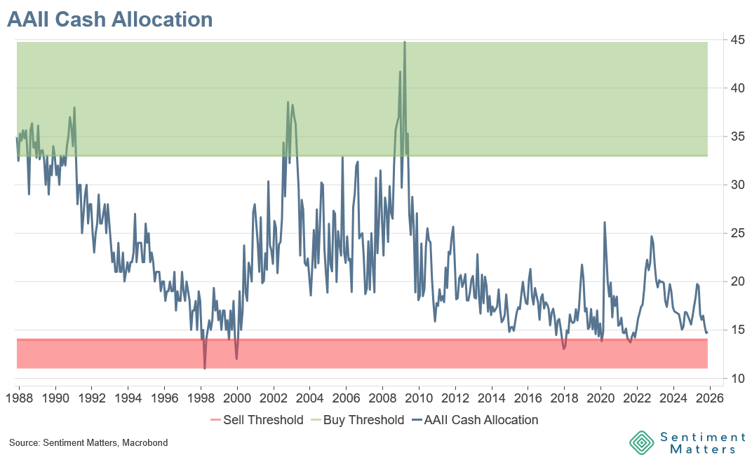 Cash allocations at 14.8% are in the 6th percentile since 1987, just above the 14% historical sell threshold. Below that level, the average forward 12-month S&P 500 return has been flat, and below average 74% of the time.