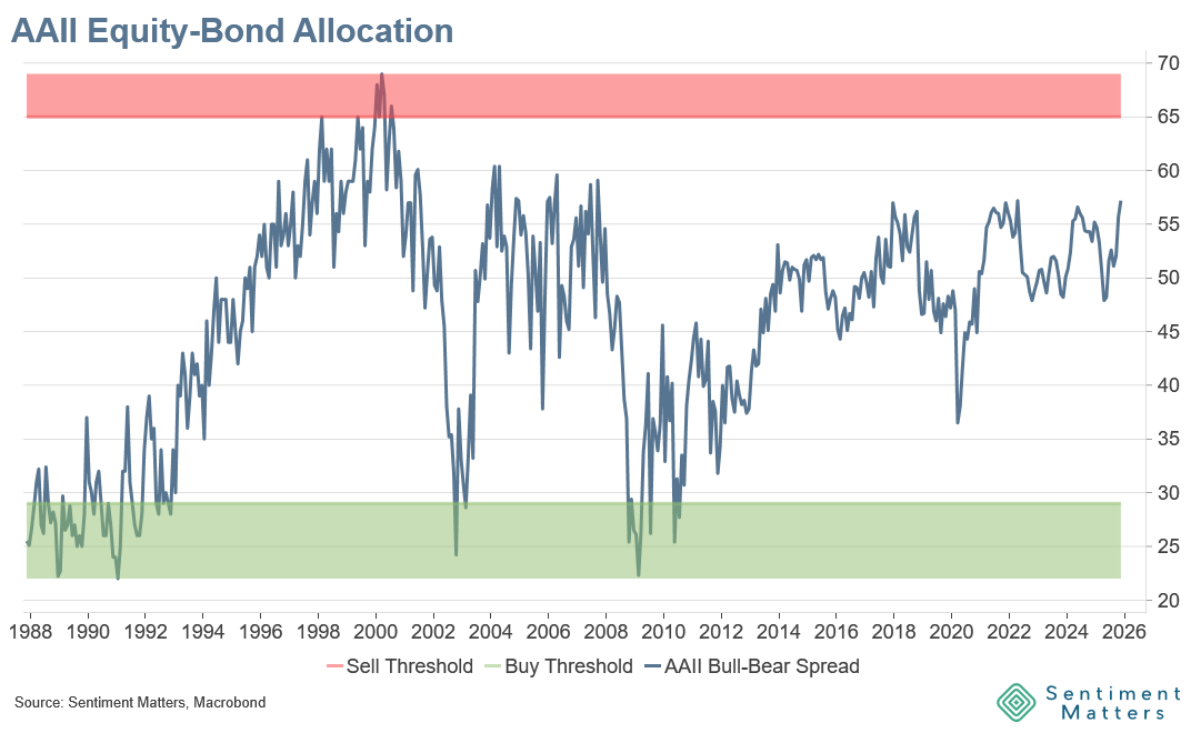 Rising markets have pushed sentiment a bit deeper into bullish territory, which means the “runway” before sentiment becomes a headwind is getting shorter. Equities are back near the highs, but sentiment hasn’t fully followed — the gap has narrowed, yet sentiment still sits well below previous peaks.